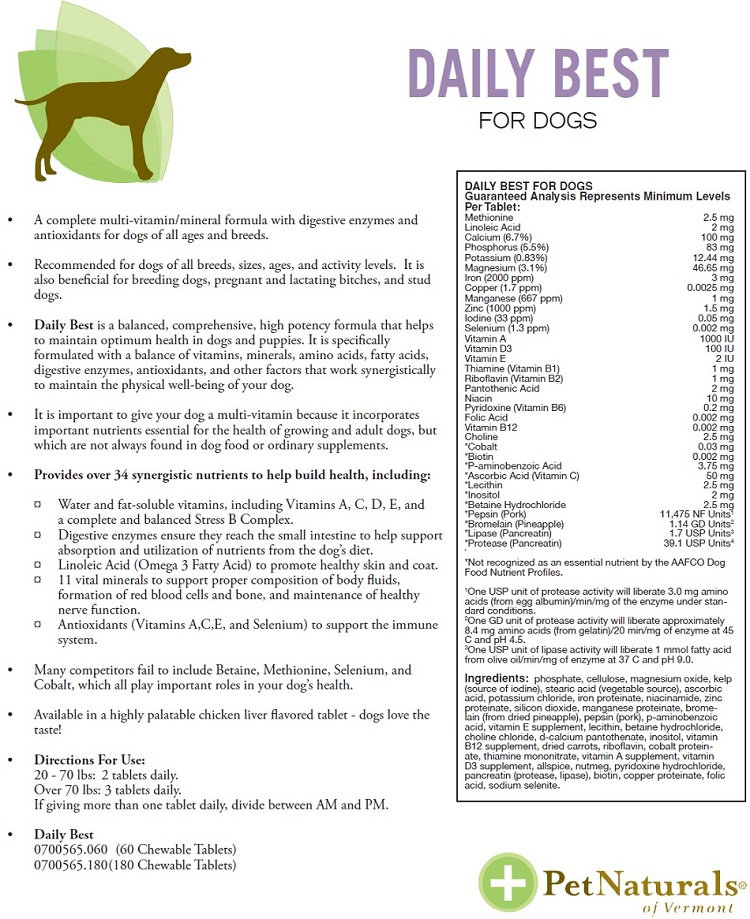 Daily Best for Dogs is a comprehensive multivitamin and mineral formula that includes nutrients to support optimal health and provide nutritional support to dogs of all ages, sizes, breeds and activity levels; it is also beneficial for breeding dogs, pregnant and lactating females, and stud dogs. We’ve included digestive enzymes, antioxidants, B complex, Omega-3 fatty acids for skin and coat health, and selenium to support immune system function, all in a tasty chicken liver-flavored chewable tablets that dogs love!